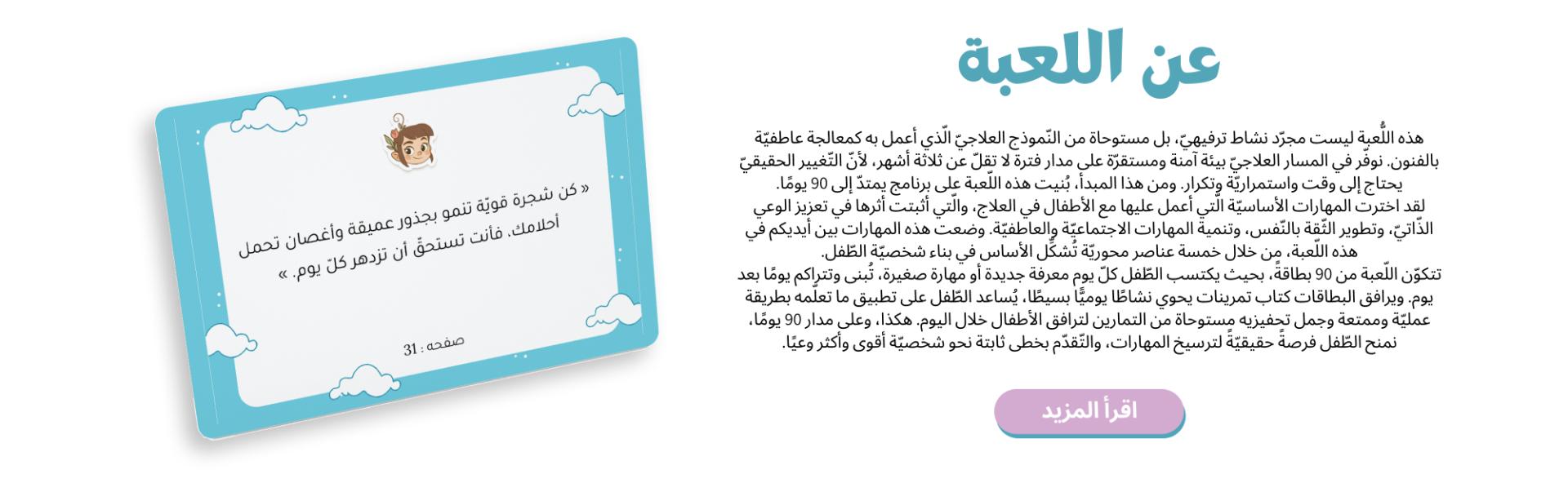هي أداة عائليه فريدة على شكل لعبة وتحدي لمدة 90 يومًا، تساعد الأطفال على التعرف على مشاعرهم وقواهم الداخلية وتنمية القيم، بشكل ممتع وتفاعلي لتنشئ شخصيه واعيه واثقه ومتزنه.
