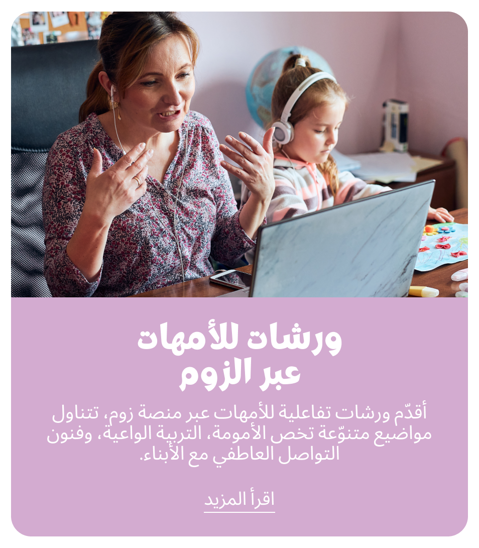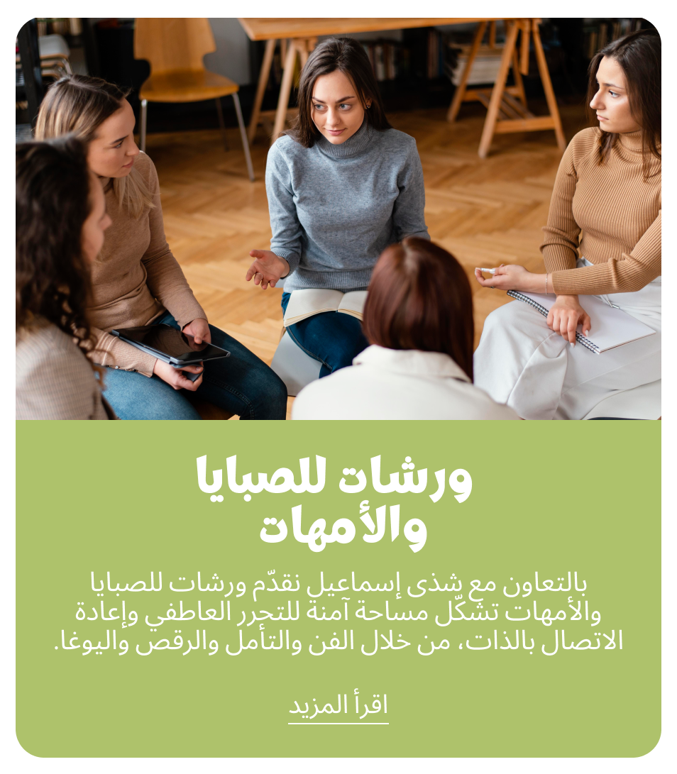 نعم، نوفر ورشات للأمهات عن تحديات التربيه عبر الزوم، بالإضافة إلى ورشات وخلوات (ريتريت) في الطبيعة للصبايا والنساء بالتعاون مع شذى إسماعيل. هذه الورشات تشكل مساحه امنه للتحرر العاطفي العميق وإعادة الاتصال بالذات.
