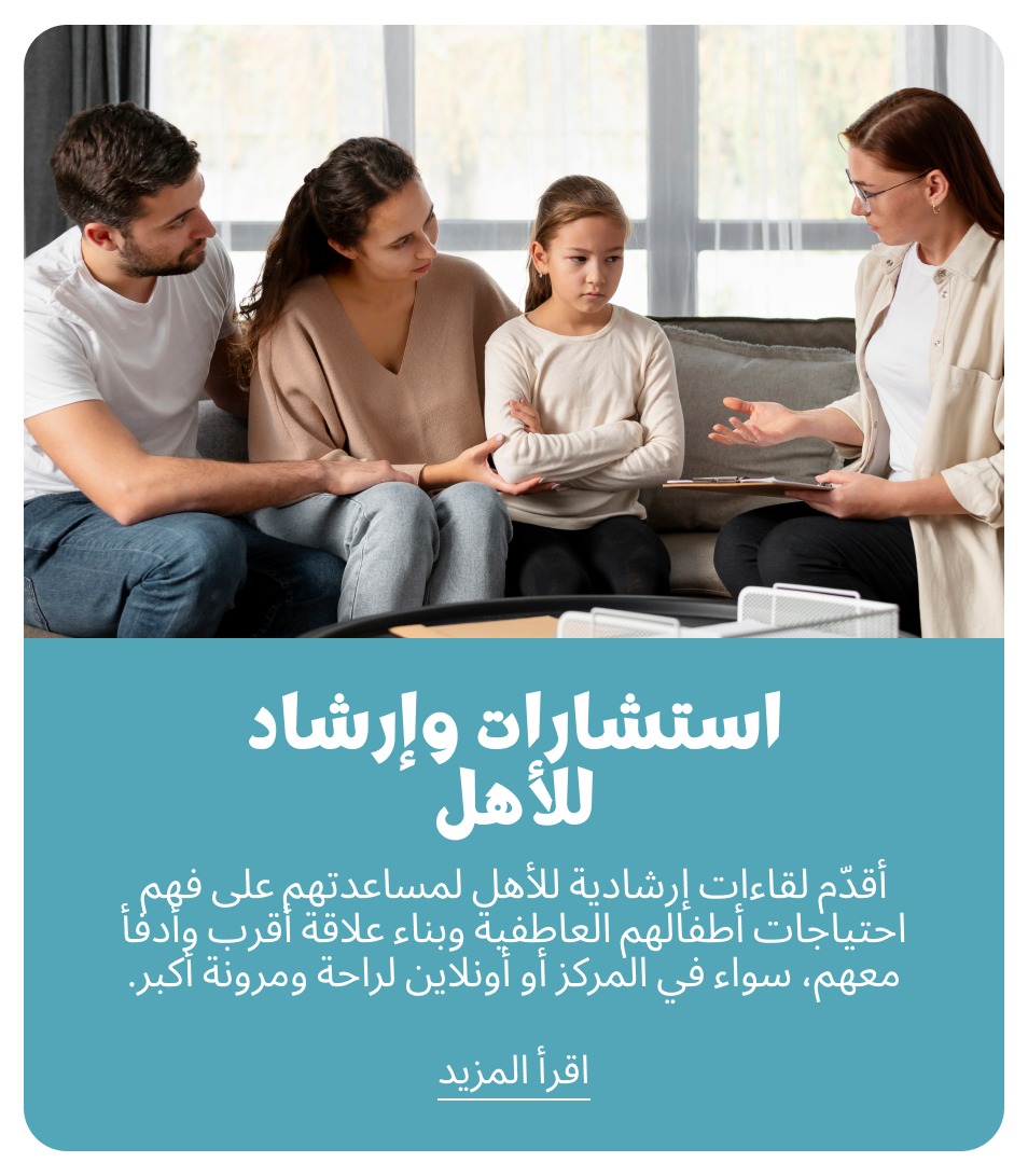نعم، يمكن للأهل اختيار استشارات عبر الإنترنت (زوم) بما يتناسب مع وقتهم وظروفهم. علاجات اونلاين فقط للبالغين.